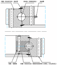 這種開式裝配非常方便,上下圓弧滾道的承載角都為90°,能承受很大的軸向力和傾翻力矩。當徑向力大于0.1倍的軸向力時滾道須特殊設計。雙排球式回轉支承的軸向、徑向尺寸都比較大,結構堅固,特別適用于要求中等以上直徑的塔式起重機、汽車起重機等裝卸機械上。
